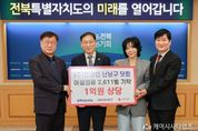 (케이시사타임즈) 전북특별자치도는 20일 도청에서 ㈜엔라인이 운영하는 온라인 여성의류 쇼핑몰 ‘난닝구닷컴’의 의류 기탁식을 개최했다. 이날 기탁식에는 김관영 도지사와 이정민 ㈜엔라인 대표, 전북사회복지공동모금회 한명규 회장 등이 참석해 기탁 물품을 전달하고 나눔의 의미를 함께 나눴다. 이번에 기탁된 물품은 의류 2,611벌(약 1억 원 상당)로, 전북사회복지공동모금회를 통해 도내 저소득 세대와 사회복지시설 등 지원이 필요한 현장에 순차적으로 전달될 예정이다. 도는 현장 수요를 면밀히 반영해 배분 과정에서 지원 공백이 발생하지 않도록 관리하고, 기업과 지역사회가 함께하는 민관 협력을 더욱 확대해 취약계층 의생활 지원을 강화해 나갈 방침이다. 노홍석 전북자치도 행정부지사는 “기업의 자발적인 나눔이 지역사회에 큰 힘이 되고 있다”며 “기탁 물품이 꼭 필요한 이웃에게 신속하고 공정하게 전달될 수 있도록 도에서도 책임 있게 뒷받침하겠다”고 밝혔다. 이정민 ㈜엔라인 대표는 “이번 기탁이 도움이 필요한 이웃들의 일상에 작은 보탬이 되길 바란다”며 “앞으로도 지역사회와 함께하는 나눔을 지속적으로 이어