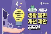 (케이시사타임즈) 용인특례시 기흥구는 오는 6일부터 5월 4일까지 ‘2026 기흥구 생활불편개선 제안 공모전’을 개최한다. 이번 공모전은 일상에서 시민이 직접 체감하는 불편사항을 발굴하고, 이를 개선할 수 있는 다양한 방안을 모색하고자 마련됐다. 주제는 일상생활에서 체감하는 생활 불편 개선 아이디어다. 시설·환경 등 각종 생활 불편 사항이나 비효율적인 행정이나 규제 등 다양한 분야의 의견을 받는다. 생활 불편에 관심 있는 누구나 참여할 수 있다. 시 누리집 ‘용인소식’의 ‘고시공고’ 또는 기흥구 누리집 ‘참여광장’의 ‘기흥소식’에서 서식을 내려받아 작성하면 된다. 작성한 제안은 방문‧우편(기흥구 관곡로 95 기흥구청 별관 2층 자치행정과 기획감사팀)으로 내면 된다. 전자우편으로도 제출할 수 있다. 부서 검토와 제안공모심사위원회 검토를 거쳐 최종 선정된 제안은 시상금(최대 100만 원)이 지급된다. 또 관련 부서 검토 등을 거쳐 행정에 반영하거나 실효성 있는 정책으로 이어질 수 있도록 추진할 방침이다. 자세한 사항은 시 또는 구 누리집에서 확인할 수