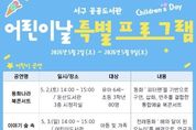 (케이시사타임즈) 대전 서구 갈마·가수원·둔산·월평·어린이도서관은 내달 2일부터‘어린이날 특별 프로그램’을 운영한다. 이번 프로그램은 문화예술 공연과 체험 활동을 함께 즐길 수 있도록 구성된 독서 문화 프로그램으로, 온 가족이 도서관에서 다채로운 문화 경험을 할 수 있도록 마련됐다. 공연 프로그램으로는 △동화나라 북콘서트(둔산도서관) △이야기 숲 속 음악극(어린이도서관)이 운영된다. 그림책을 바탕으로 이야기와 음악, 연기가 어우러진 공연을 통해 어린이들에게 흥미롭고 몰입감 있는 문화예술 경험을 제공할 예정이다. 체험 프로그램은 양말목을 활용한‘나만의 도서 대출 카드 지갑 만들기’ 업사이클링 활동이 있다. 재활용 소재를 활용해 자신만의 개성 있는 도서 대출 카드 지갑을 만들며 환경 보호의 중요성을 배울 수 있다.
