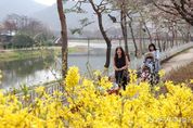 (케이시사타임즈) 충북 괴산군 괴산읍 동진천변 산책로에 봄꽃이 피어 나들이객들의 발길이 이어지고 있다. 개나리 뒤편 산책로를 따라 연분홍빛 벚꽃도 꽃망울을 터트리기 시작해 봄 정취를 더한다. 전경에 가득 찬 개나리 물결 사이로 가족 단위 나들이객들이 산책을 즐기고 있다. 동진천은 화사한 봄꽃에 이어 음악분수, 미디어파사드, 괴산오작교를 비롯한 수변 공간을 두루 갖춰 주야간 내내 주민과 방문객에게 사랑을 받고 있다.