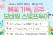(케이시사타임즈) 울산 울주군이 봄을 맞아 오는 23일부터 다음달 30일까지 한시 관광이벤트를 진행한다고 20일 밝혔다. 이번 한시 이벤트는 다양한 연계 이벤트로 울주군 방문 관광객의 참여도와 만족도를 높이고, 체류시간과 지역소비를 확대하기 위해 마련됐다. 올해 새롭게 리뉴얼된 K스탬프투어 모바일 앱을 이용한 ‘봄꽃 가득, 울주’ 이벤트와 ‘울주와봄’ SNS 여행후기 인증 이벤트 등으로 구성됐다. ‘봄꽃 가득, 울주’ 이벤트는 울주군 내 지정 봄꽃 명소 10개소 중 8개소 이상을 방문해 스탬프를 획득한 뒤 선물을 신청하면 된다. 주요 코스는 울주군 벚꽃 명소인 △작천정 벚꽃길 △서생포왜성 △두서면 차리마을 벚꽃길 △회야강변 벚꽃길 등이다. 울주군은 이벤트 참여자 중 추첨을 거쳐 총 70명을 선정해 울주특산품을 제공한다. ‘울주와봄’ SNS 여행후기 인증 이벤트는 ‘봄꽃 가득, 울주’ 이벤트 코스 중 1개소의 사진과 울주군 숙박시설, 식당, 카페 중 1개소 영수증을 첨부해 개인 SNS(인스타그램)에 게시하면 된다. 여행후기 작성자 중 70명을 추첨해 울주 특산품을
