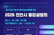 (케이시사타임즈) 천안시는 오는 24일 천안과학산업진흥원과 함께 천안SB플라자에서 ‘중소기업 지원 및 과학기술사업화를 위한 2026 천안시 통합설명회’를 개최한다고 11일 밝혔다. 이번 설명회는 시와 관련된 기관·단체에서 추진하는 중소기업 지원사업에 대한 종합정보를 제공하고, 과학기술사업화 유관기관의 지원사업을 안내하기 위해 마련됐다. 설명회에는 중소기업 지원, 연구개발(R&D), 금융·보증, 기술사업화, 투자 분야의 공공기관 , 연구기관 등 22개 기관이 참여하며, 주요 정책 발표와 1:1 상담 부스 등을 통해 맞춤형 정보를 제공할 예정이다. 시 관계자는 “이번 설명회를 통해 중소기업들이 다양한 지원제도를 효율적으로 제공받을 수 있길 바란다”고 말했다.
