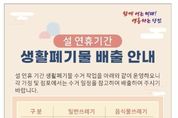 (케이시사타임즈) 당진시는 설 연휴를 기간 시민 불편을 최소화하고 쾌적한 도시 환경을 유지하기 위해 연휴 기간 중 생활폐기물 수거 일정을 조정·운영한다고 11일 밝혔다. 시에 따르면 설 연휴 기간인 2월 14일부터 2월 18일까지 일반쓰레기와 음식물쓰레기 수거가 일부 조정된다. 2월 14일과 16일은 일반쓰레기와 음식물쓰레기를 모두 정상 수거하며, 2월 15일에는 일반쓰레기는 제한 수거하고 음식물쓰레기 수거는 중단한다. 또한 2월 17일과 18일에는 일반쓰레기와 음식물쓰레기 모두 제한 수거를 실시한다. 제한 수거 기간에는 대로변 등 일부 지역을 중심으로 수거가 이뤄지는 만큼, 시민들의 쓰레기 배출에 각별한 주의가 필요하다. 당진시는 연휴 기간 중 발생하는 불편을 줄이기 위해 생활폐기물은 가급적 정상 수거일 전날 일몰 후에 배출해 줄 것을 당부했다. 아울러 각 가정과 점포에서는 수거 일정을 사전에 확인해 무단 배출이나 장기 적치를 자제해 달라고 요청했다. 시 관계자는 “설 연휴 기간 수거 일정 조정으로 불편이 발생할 수 있으나, 시민 여러분의 협조가 쾌적한 주거환경 조성에 큰 도움이 된다